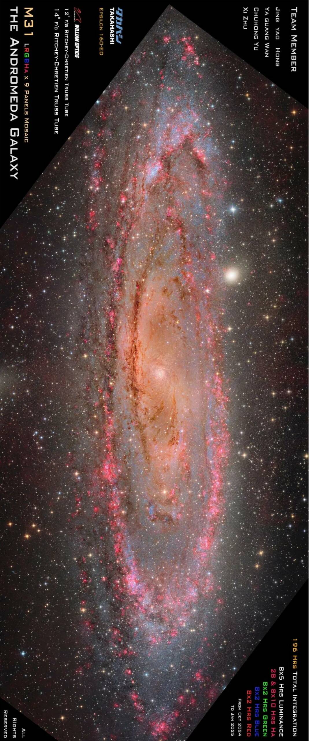 Among them, Xi Zhu stands out as a highly experienced astrophotographer, well-known within the community and often invited as a judge in competitions. His deep passion for both astronomy and imaging, along with his constant sharing of techniques and insights, played a crucial role in bringing this M31 project to completion.