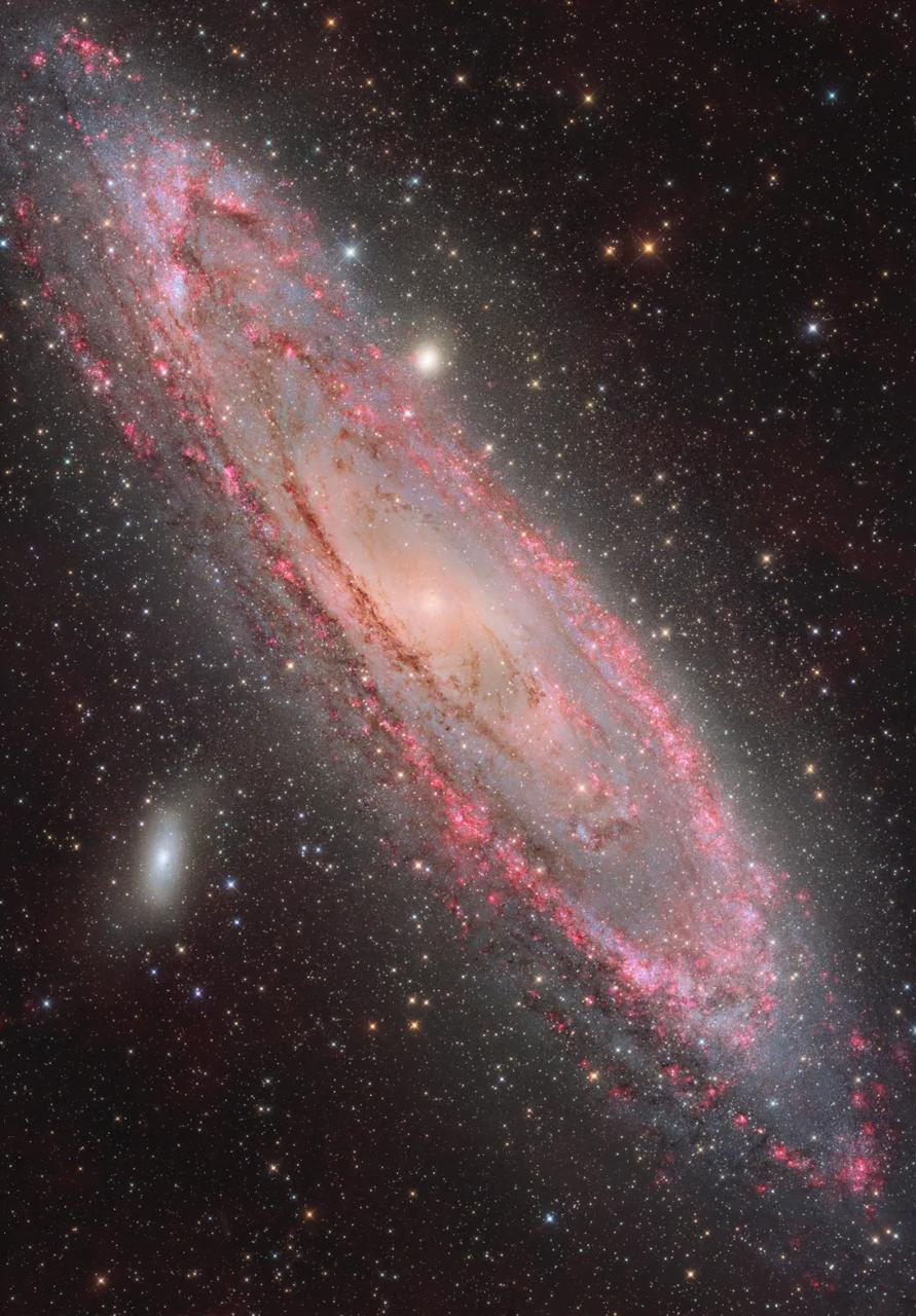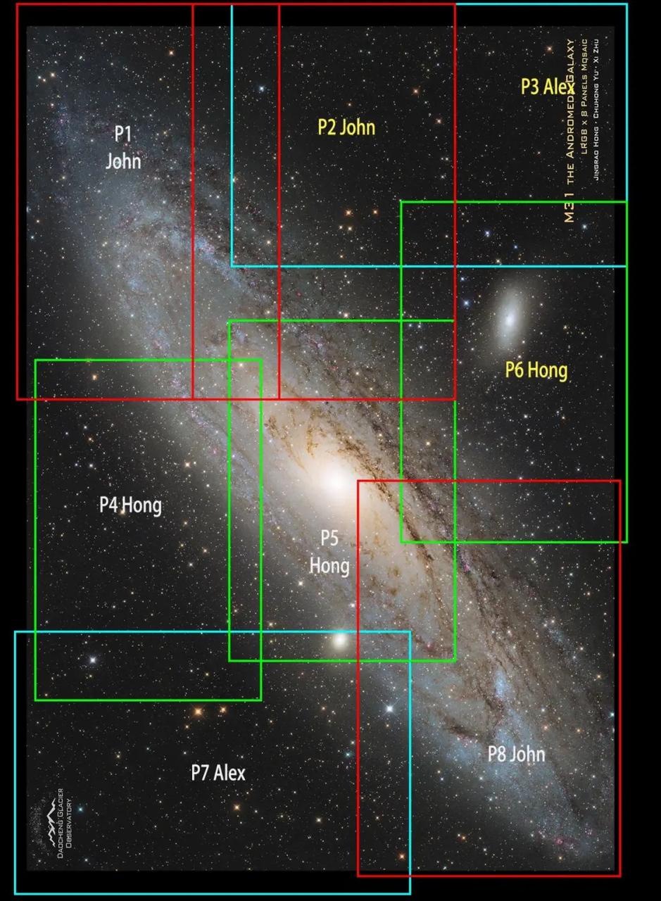 “This is one of the first successful long focal-length mosaic M31 projects at this scale—8 to 9 panels—completed in both the AstroBin.”