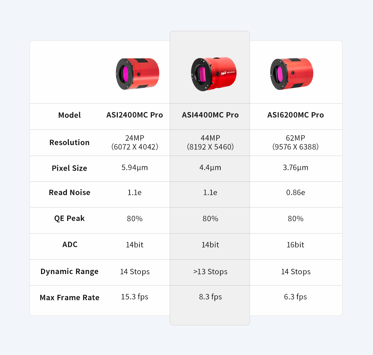 Positioned between the ASI6200MC Pro and the ASI2400MC Pro, the ASI4400MC Pro strikes the perfect balance between image quality and efficiency, giving users a versatile option within the full-frame lineup.
