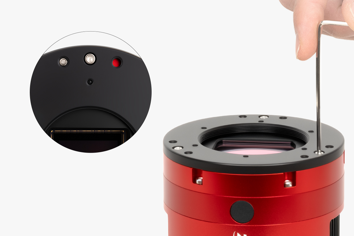 The ASI4400MC Pro includes three sets of sensor tilt adjustment screws. Each set has a push and a pull screw that let you fine-tune the sensor’s alignment with your telescope’s optical axis. This adjustment helps correct any slight tilt that can cause stars to appear elongated or out of focus toward the edges of the frame, ensuring sharp, even focus across the entire image.