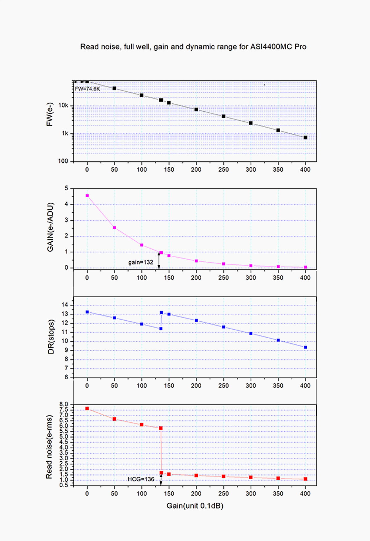The ASI4400MC Pro offers a dynamic range of up to 13 stops, allowing it to capture both bright highlights and faint shadow details in a single exposure. This wide range is key to achieving high dynamic range (HDR) performance, preserving fine tonal transitions and subtle color detail in deep-sky images. When the gain setting reaches 136, the camera automatically activates HCG (High Conversion Gain) mode, which greatly reduces read noise while maintaining full dynamic range. This means you can increase sensitivity for faint targets without adding unwanted gain noise, making it easier to capture clean, detailed images under a variety of conditions.