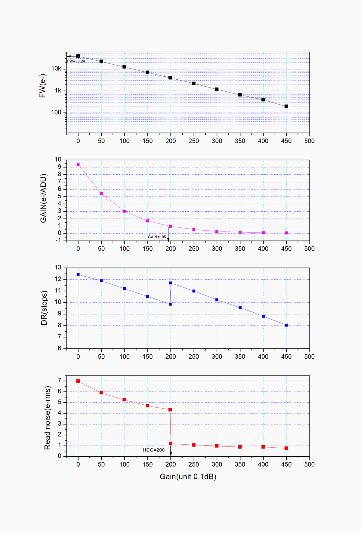The QE curve and readout noise are very important parameters to measure the camera’s performance. Higher QE and lower readout noise are necessary to improve the image signal-to-noise ratio.